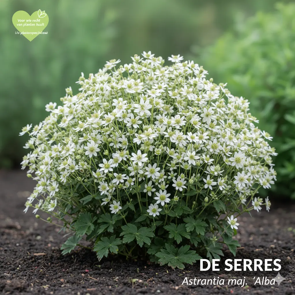 Zeeuwsknoopje 'Alba' (Astrantia major) is een opgaande vaste plant die van juli tot augustus zilverwitte, stervormige bloemen vormt bij elkaar in trossen. De handvormige bladeren zijn middengroen van kleur. Op een halfschaduwrijke standplaats met goed gedraineerde, humusrijke, voedingsrijke grond bereikt hij meestal een hoogte van ongeveer 70 cm en wordt hij ongeveer 60 cm breed. Zeeuwsknoopje 'Alba' is goed vorstbestendig.