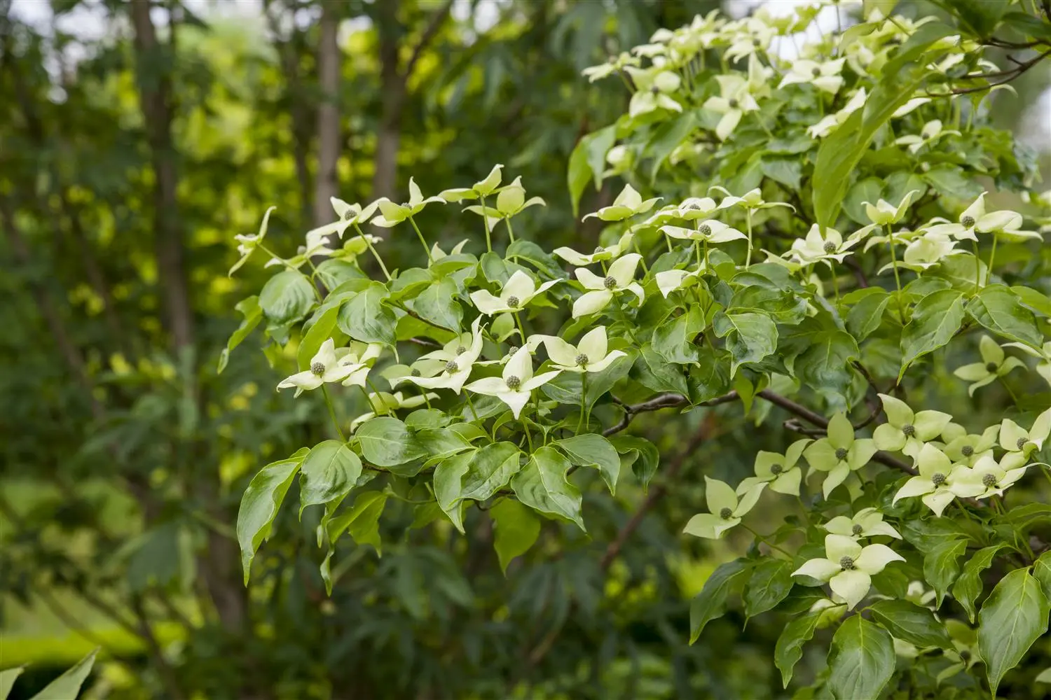 De Japanse grootbloemige kornoelje (Cornus kousa chinensis) is een rechtopstaande, overhangende grote struik met decoratieve, rozerode vruchten. Hij produceert witte bloemen bij elkaar van eind mei tot juni. De Japanse grootbloemige kornoelje heeft ook ovale, middelgroene bladeren. Op een zonnige tot halfschaduwrijke plek met natuurlijk zure grond wordt hij meestal zo'n 10 meter hoog en zo'n 8 meter breed.