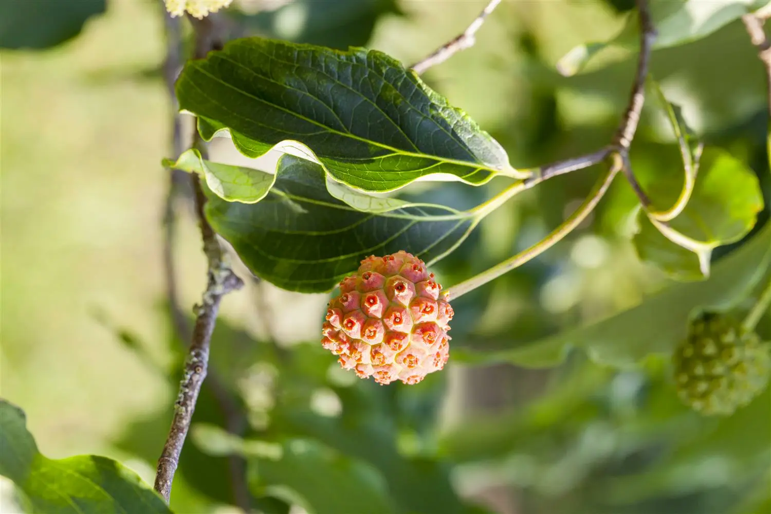 - VruchtDe roze, ronde bessen van Cornus kousa 'White Fountain' zijn bijzonder decoratief. Deze verschijnen vanaf september.