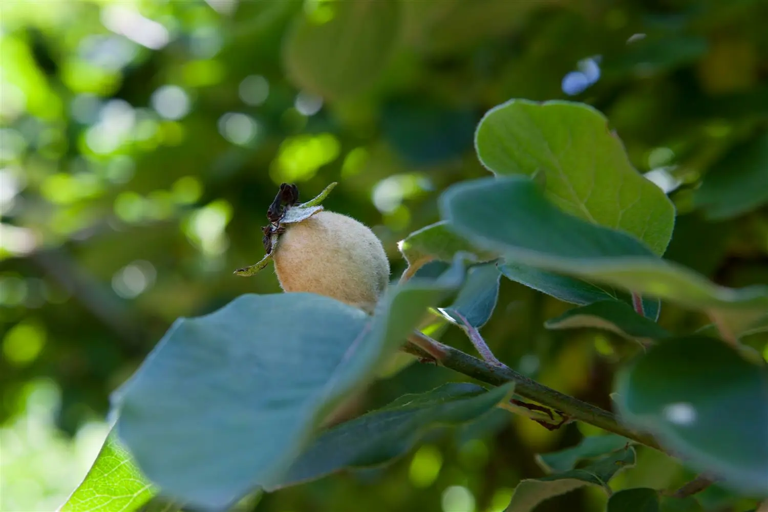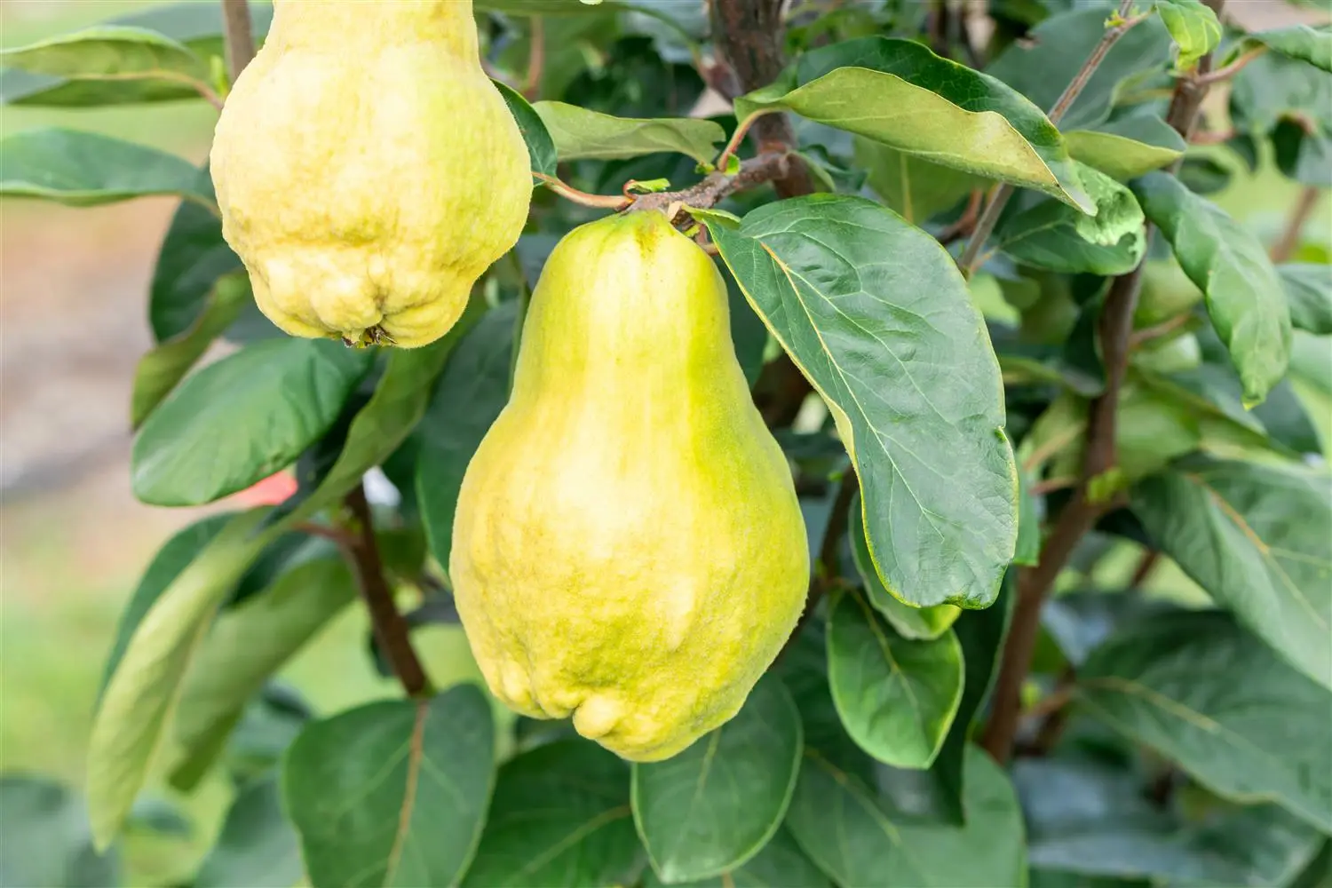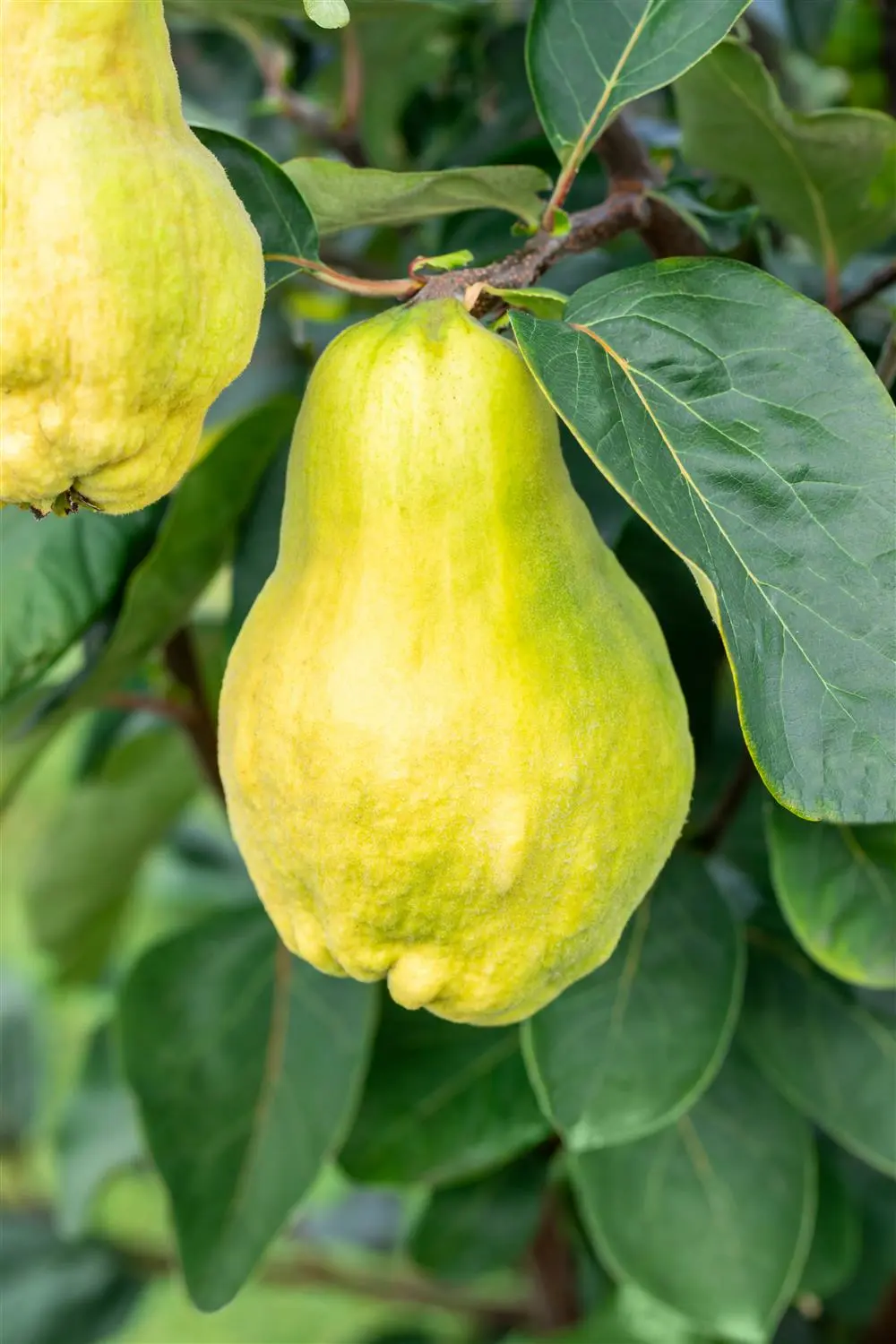 - VruchtCydonia oblonga 'Champion' vormt goudgele, peervormige vruchten.