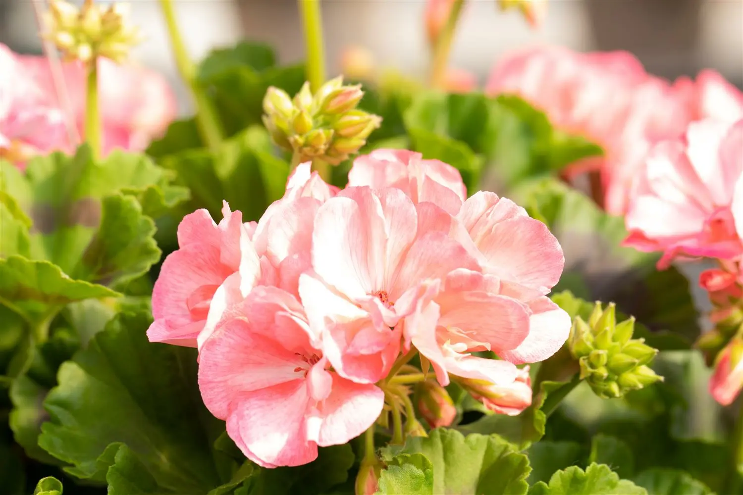 De Staande geranium 'Survivor Idols Appleblossom Splash' (Pelargonium zonale) is een populaire, gemakkelijk te verzorgen plant voor op het balkon die het hele seizoen door ontelbare roze-witte, halfgevulde bloemen produceert. De middelgroene bladeren zijn rond. Een zonnige tot halfschaduwrijke standplaats en een goed gedraineerd substraat hebben de voorkeur.