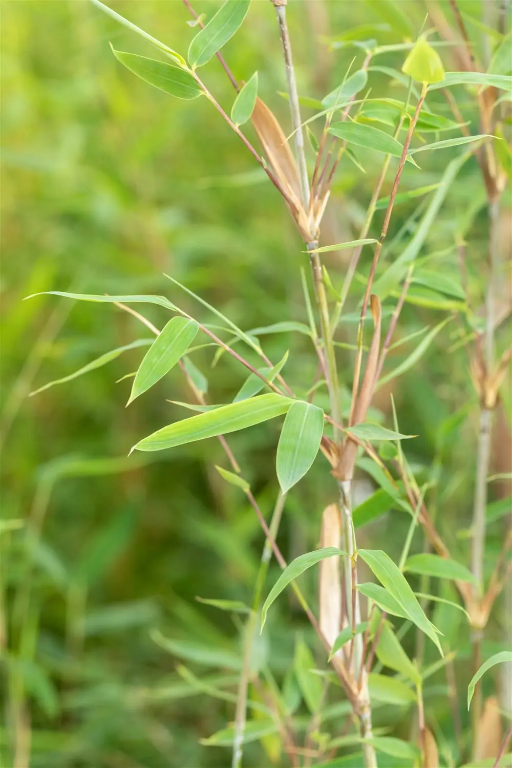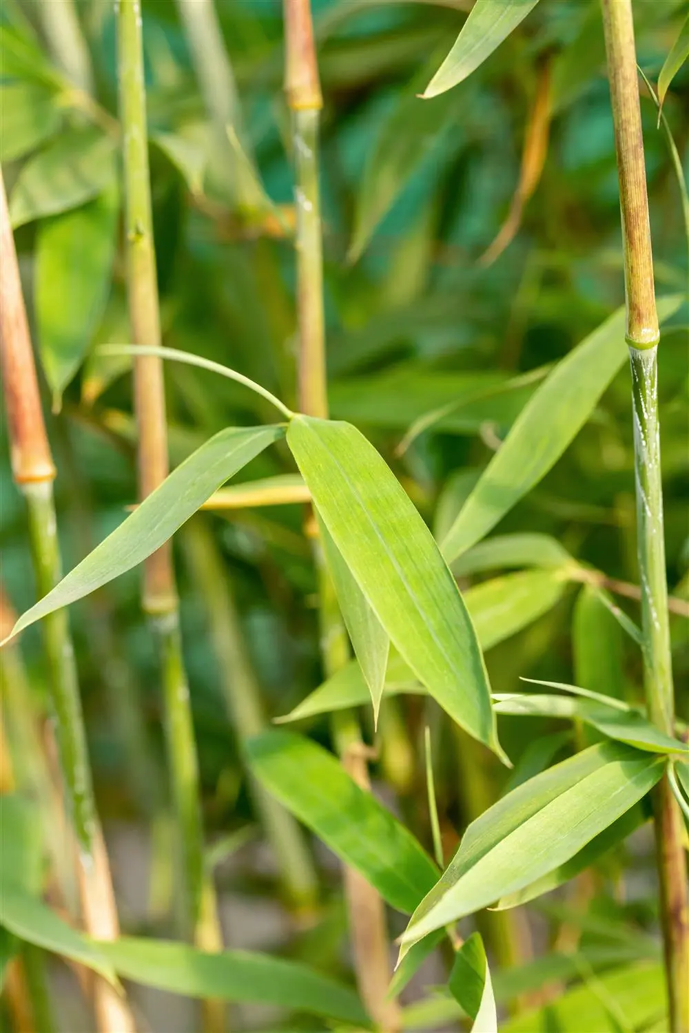 Met zijn lichtgroene bladkleur en rode stengels is Bamboe 'Winter Joy' (Fargesia nitida) een decoratieve eyecatcher in de tuin. Wat hem zo bijzonder maakt, naast zijn spreidende, dichte en polvormende vorm, is dat hij geen wortelstokbarrière nodig heeft! Hij geeft de voorkeur aan halfschaduwrijke tot schaduwrijke plaatsen met goed gedraineerde, humusrijke, natuurlijk en voedingsrijke grond. In gunstige omstandigheden bereikt deze winterharde bamboe een hoogte van ongeveer 4 m en wordt hij tot 2 m breed.