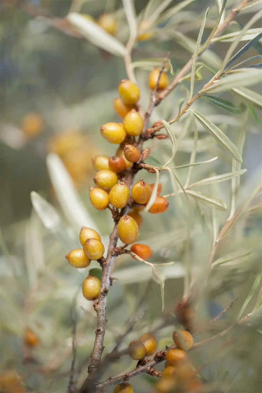 De Duindoorn (Hippophae rhamnoides) produceert oranjerode bessen. Deze zijn sappig en zuur, met een aromatische smaak. Goed gedraineerde, kalkhoudende zandgrond en een zonnige locatie creëren de ideale omstandigheden voor een oogst met een hoge opbrengst vanaf augustus.