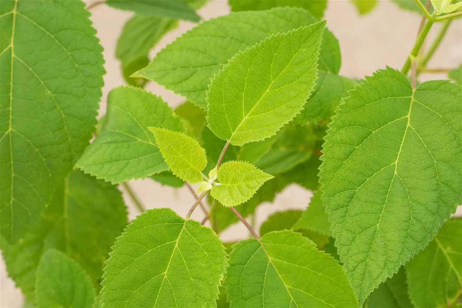 - BladerenDe bladverliezende bladeren van de Hortensia 'Strong Annabelle' zijn middengroen, ovaal, tegenoverstaand.