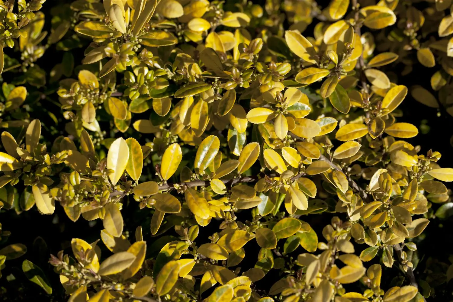 - BladerenDe altijd groene bladeren van de Japanse hulst 'Golden Gem' zijn goudgeel, rond, afwisselend. Ze zijn ongeveer 1 - 2 cm groot.