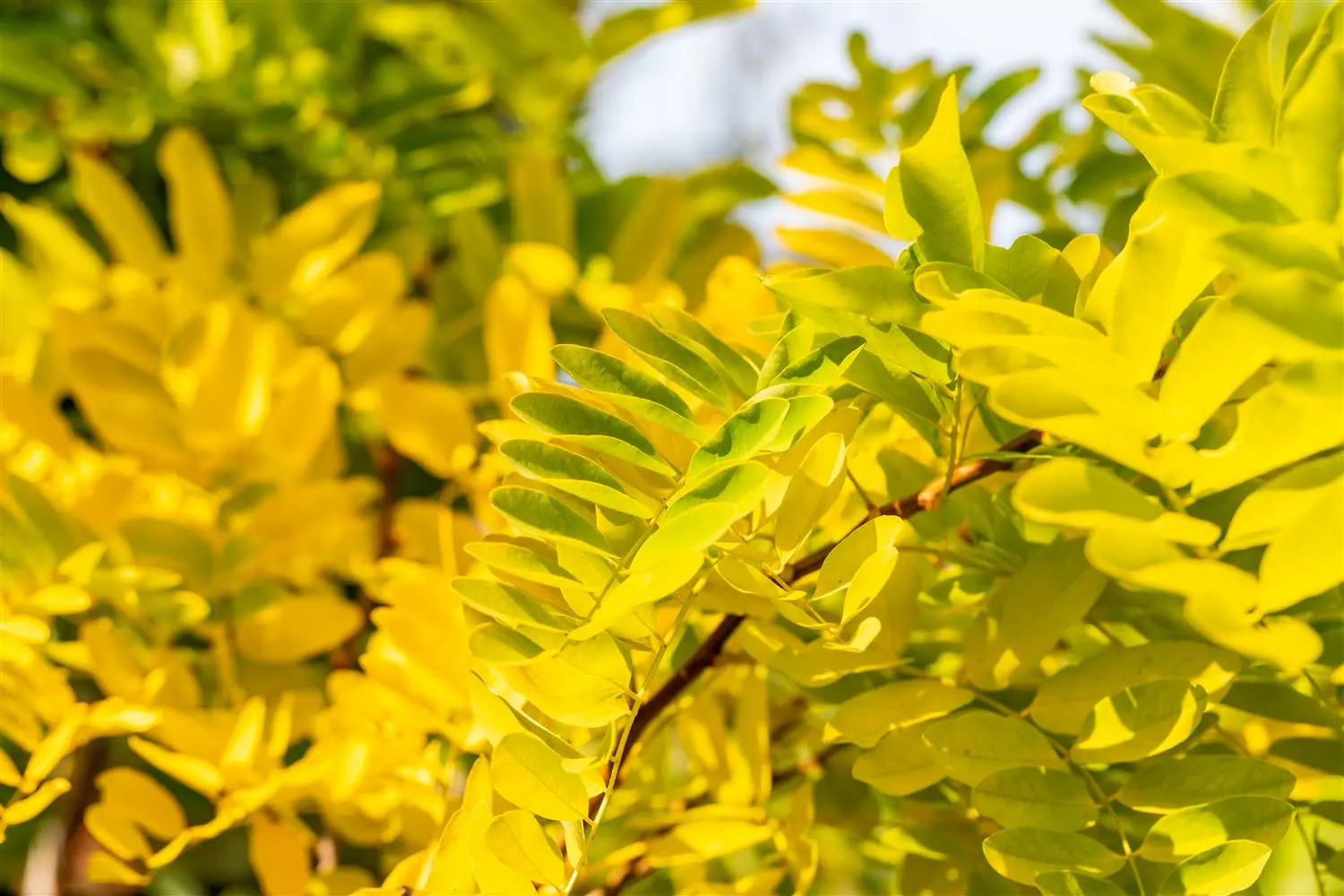 - BladerenHoge blad- en sierwaarde. De bladverliezende bladeren van Valse acacia 'Frisia' zijn geelgroen, geveerd, afwisselend. Oranjegeel, late scheuten. Valse acacia 'Frisia' kleurt helder goudgeel in de herfst.