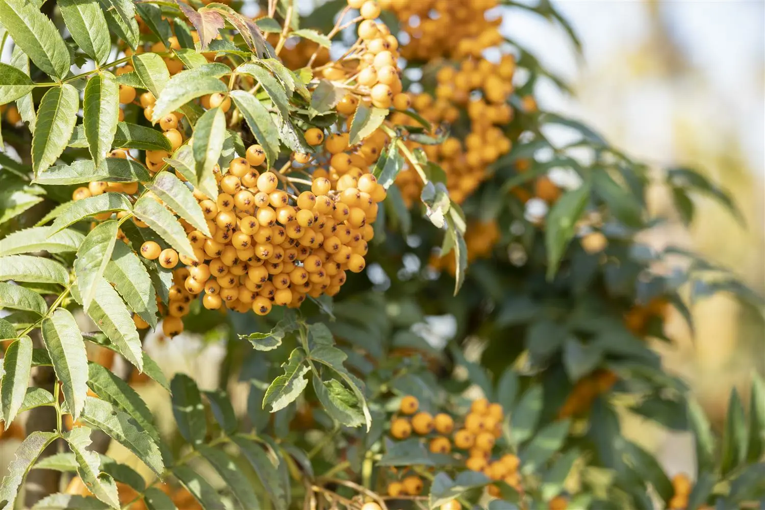 - VruchtDe oranjegele, ronde vruchten van Sorbus aucuparia 'Autumn Spire'® zijn bijzonder decoratief. Deze verschijnen vanaf augustus.