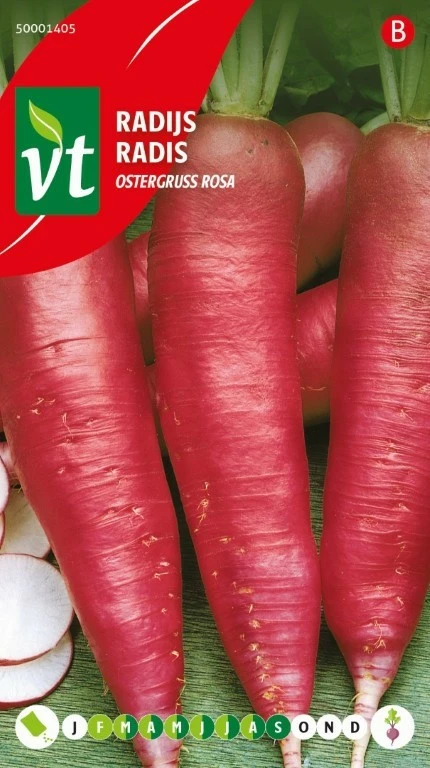Vroeg in het voorjaar zaaien onder beschutting, vanaf april in de volle grond. Zaaidiepte 1 tot 2 cm in rijtjes op 30 cm van elkaar. Dun na opkomst uit zodat de planten 10 cm van elkaar staan. Met regelmaat water geven zorgt voor een gelijkmatige groei en bevordert de smaak. De groei verloopt trager dan bij de klassieke ronde radijsjes, reken op 5 tot 6 weken tussen zaaien en oogsten.
