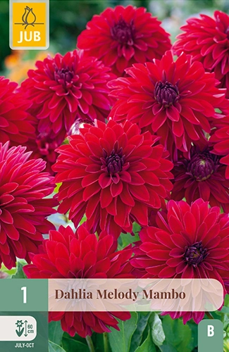 1 Dahlia 'Melody Mambo' in een verpakking met grote kleurenfoto en plantinstructies.Voorraad